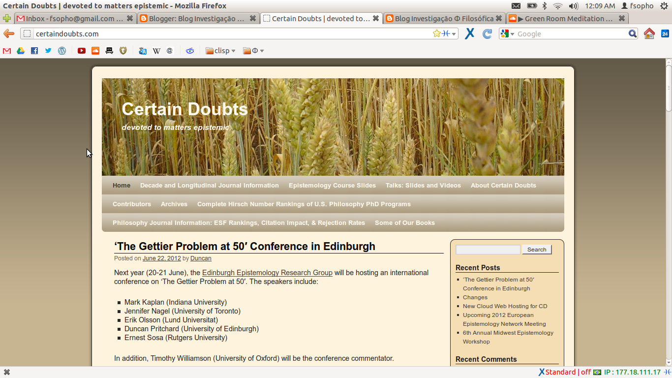 Você conhece o Certain Doubts? Trata-se da maior vitrine da epistemologia analítica contemporânea em circulação na web. Então, vale a pena dar uma conferida nestas duas seções do site: os slides de cursos disponibilizados, onde você encontra material sobre as valiosas distinções foundationalism/coerentism e internalism/externalism, entre outras, e os slides de conferências. Além disso, é sempre frutífero ficar de olho no timeline do site - posts muito interessantes sobre pragmatic encroachment, puzzles sobre racionalidade e sobre tudo o que está na agenda epistemológica contemporânea.